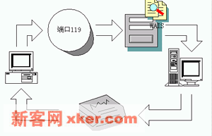 NNTP工作原理??在上一节对NNTP服务的感性认识基础上,我们在本节来讨论NNTP服务在IIS平台上的工作原理和实现机制。网络新闻组服务是基于NNTP协议工作的,NNTP是一个客户机/服务器协议,IIS实现服务器端平台,典型的客户端软件包括上文提到的Outlook Express以及Foxmail、Microsoft Internet Mail and News等。我们先来看一下客户机和服务器时如何实现新闻邮件传递的。