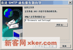 ??3.如左上图所示,在【选则IP地址】对话框中指定SMTP虚拟服务器使用的IP地址。单击【下一步】。??4.右上如图所示,在【选择主目录】对话框中,单击【浏览】指定服务器主目录,上文提到的SMTP服务文件夹都包含在服务器主目录下。注意,SMTP主目录必须位于NTFS分区中,否则向导将不予认可,但Badmail和Drop文件夹可以稍后移动到其他分区中。单击【下一步】。