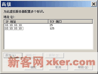 ??4.如右下图在【高级】对话框中的【地址】列表中,缺省列出了单一IP地址和默认的端口号25。单击【添加】,指定额外可用的IP地址和TCP端口号。同一虚拟服务器的标识在数量上是不受限制的。但是,如果这里指定的非缺省(25)端口号,客户端邮件程序则需要额外配置。完成后单击【确定】。