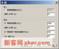 ??如右图,在【连接】选项卡中的【传入】栏中选择【限制连接数为】复选