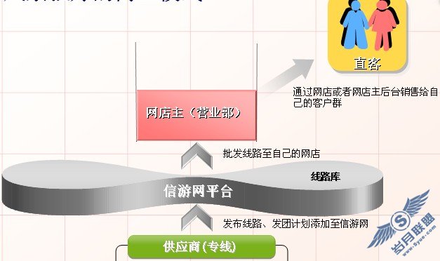 可以看出,信游网的平台是B2B2C,预估发展的模式:先发展供应商(专线),再发展网店主(营业部),最后发展直客。平台上集中了众多的旅游专线后,吸引网店主来为平台上的专线进行销售,因为网店主的收益是源自于供应商利益分成的。而直客(普通的旅游客户),登陆平台,可以在1分钟内完成在线旅游预定,操作简单:选择旅游线路——选择网店——预定线路——在线支付。
