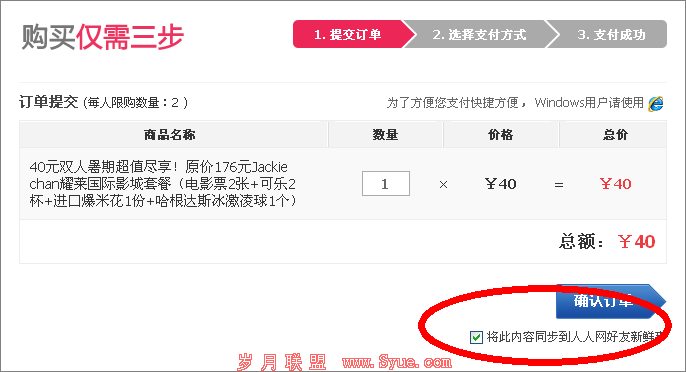 如果细心的用户就会发现上图中这样一个选择框,奥妙就在这,将SNS平台作为团购的分销渠道,还会融合SNS用户数据进行精准营销、口碑传播等,凭借人人网、猫扑网海量的用户,在北京15万人购买也就不足为奇了。