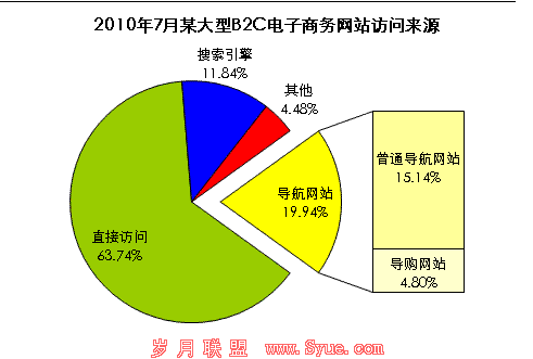 导航网站站在电子商务的角度来划分的话,我们可以把它分成两种,一种是普通的导航网站,像hao123,265,ll4la这些是普通的导航网站,还有一种就是专业的购物导航网站。从监控的数据分析,普通的导航网站的流量占了大部份,而专业的购物导航网站只占了流量的小部份,对购物网站的贡献比例大概是15%和5%。即流量15%是从普通的导航网站带过来的,而5%是从专业的购物导航网站带过来的。下面我们看一张图,是某著名购物网站的流量构成图,我们可以更直观分析他们之间的关系,如下图所示