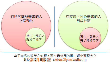 笔者从不相信什么社区电子商务之类的模式。电子商务的最核心在于 商品力,其他都只是帮这个加分的环节而已。以商务为核心去集成内 容与社区才是最正确的方式。以下,笔者使用两个圆形来将这个概念 说明清楚: