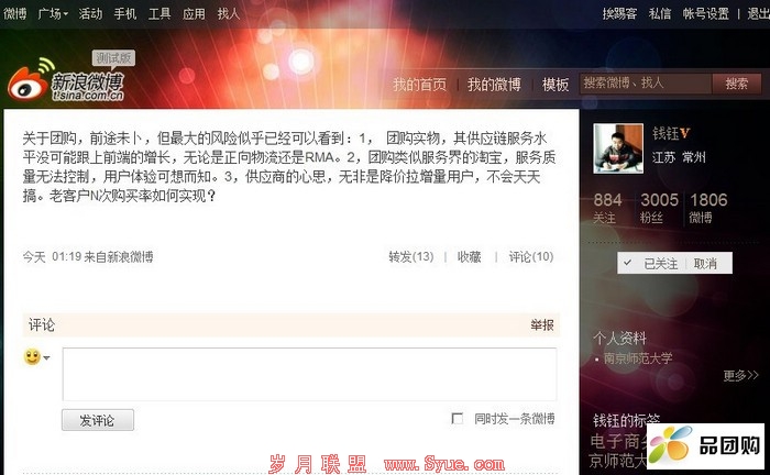 此条微博已经发布之后,引起了业内人士的关注。Enjoylife访谈群站长netfm和TMP.worldwide(中国)产品架构总监陈建闽(阿德)认为第3点并不准确,陈建闽提出“商铺要宣传是重点,少量订购就是最好。然团购网站是销售量是重点!”的观点。IT168企业互动部IXPUB社区主管齐宝玮评论表示,自己一直都不看好团购。
