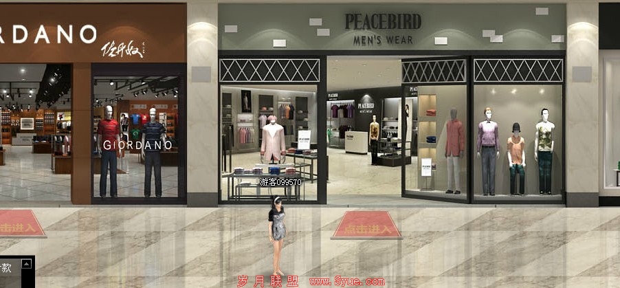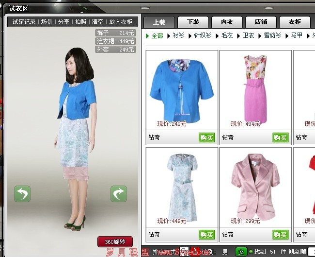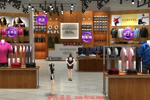 左侧的那个女士就是模拟进入这个店面的顾客,右侧弯腰的那个就是这个店的营业员;可以点击呈现在你面前的所有商品,然后查看相关信息,这里的页面设计犹如淘宝商品一样,包括图片、价格、店铺运营商家信息、购买导航等,都和你在其他的网络店铺体验一样;另外还有一个非常新颖的体验方式,“在线试衣”,会为你自动生成一个3D模特,然后提供各类服装,用户选择自己喜欢衣服的然后移动到3D模特身上,查看试衣的效果。用户可以360度查看试衣效果、设定试衣场景、放入衣柜等。