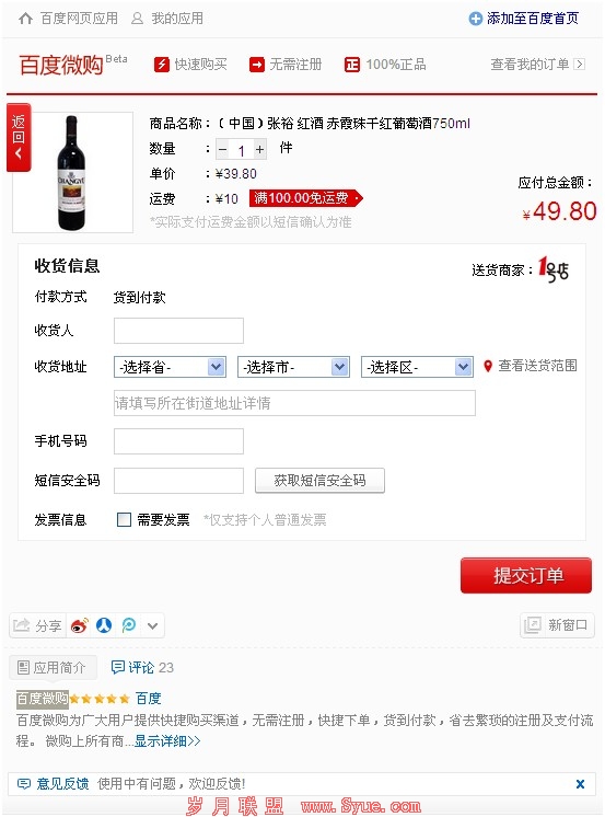 笔者留意到该应用版本为BETE版本,说明为:“百度微购为广大用户提供快捷购买渠道,无需注册,快捷下单,货到付款,省去繁琐的注册及支付流程。 微购上所有商品均由国内知名大型网上商城提供,正品保证。”笔者以为这该项应用早已经出来,特意在百度里搜索“百度微购”,但未发现任何猫腻。