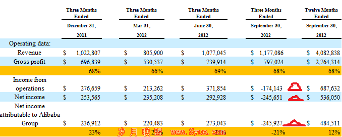从上表中可以看出,尽管归属阿里巴巴集团全年净利润(Net Income attributable to Alibaba)4.8亿美元,但是2012年第四财季(即2012年7月至9月),归属阿里巴巴集团的净利润却是亏损的。而且不仅是归属阿里巴巴集团的净利润,运营利润(Income from operations)及公司净利润(Net income)均为亏损。如上表所示,2012年第四财季,公司营业亏损1.74亿美元,公司净亏损2.45亿美元而归属阿里巴巴集团净亏损2.45亿美元。这是阿里巴巴集团自2010年第二财季(即2010年第一季度)开始盈利以来首度亏损。
