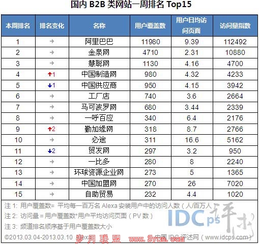 3月第二周国内B2B类网站排名Top15:阿里巴巴第一