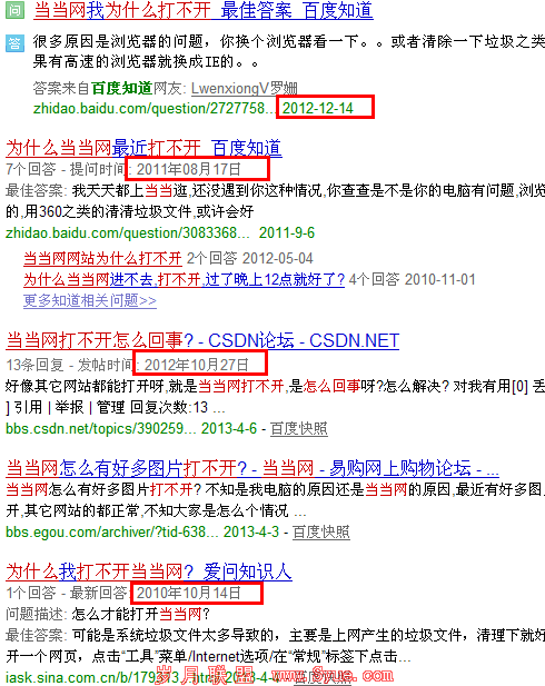 从发帖时间和网页的快照时间可以了解到,对于当当宕机已经不是头一次了,每年都会有这样的事情发生。尤其是关于当当网宕机的相关搜索结果同样令人咋舌: