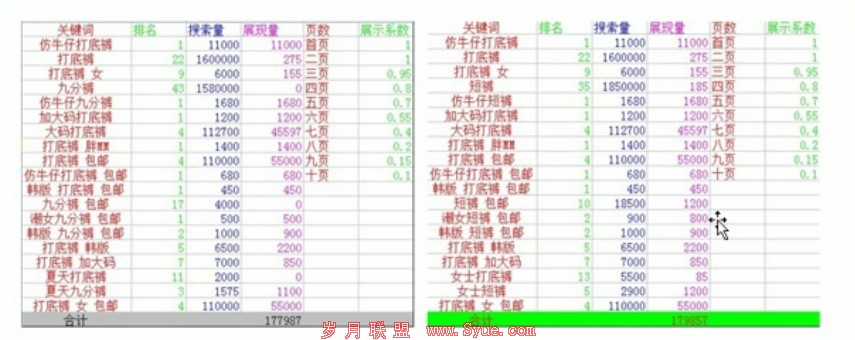 通过对比,我们很轻易的就发现点击从177987提升到了179857。效果是显而易见的。这个例子是否让你明白了怎么做呢?我们总结一下,其实就是简单的一句话:找出核心词,替换可修改关键词。(核心词:对标题展现量影响最大关联最多的关键词; 可修改关键词:没有或很少展现量,没有或很少关联的词)