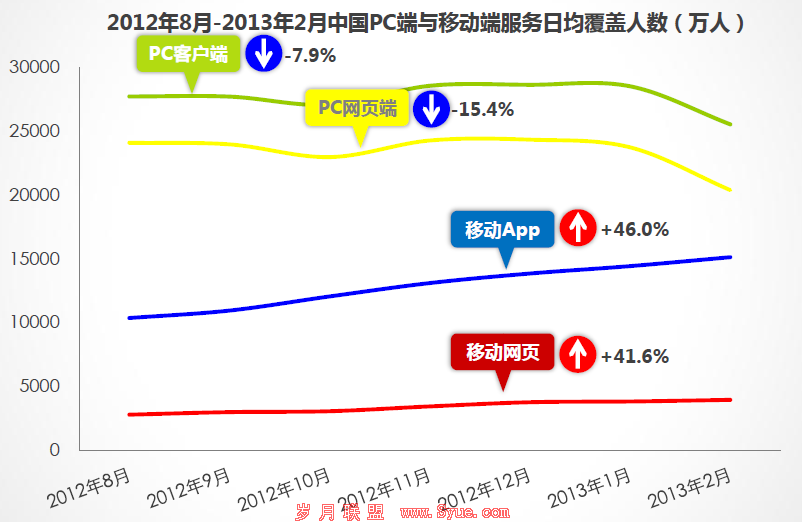 从2010年开始,智能手机已不再是商务、高端的代名词。国内厂商为了开通低端消费市场,研发了低端智能手机,原有的功能机市场开始被智能手机取代,智能手机越来越普及,截至2012年12月,中国智能手机用户达到3.8亿人。其实移动终端使用率越来越多,PC端使用率越来越少,如下图: