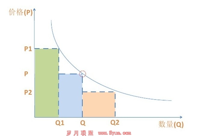 如果成本在可控范围内,那都会选择把价格定在靠近中间的位置,因为这样 交易额= 价格x 数量 的面积最大。如下图: