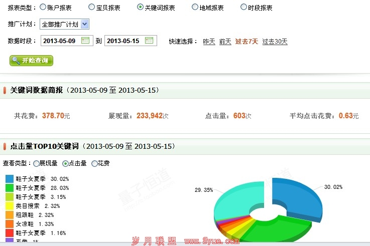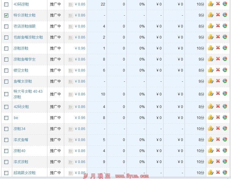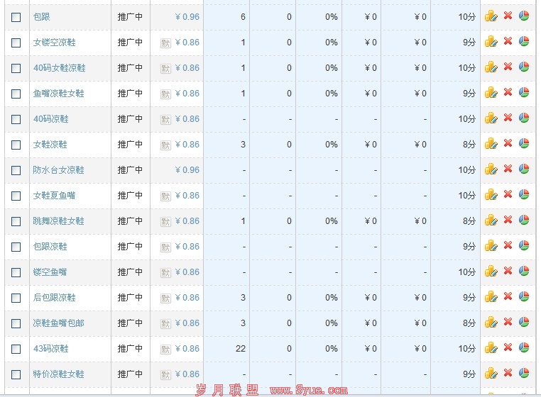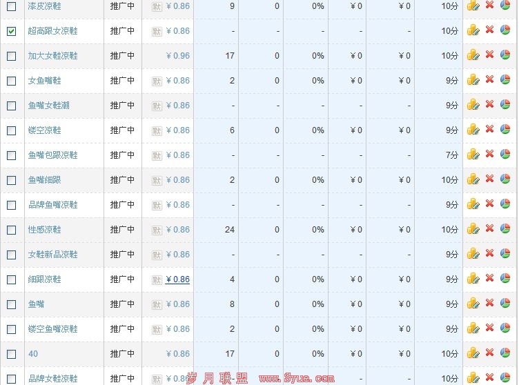 何为质量得分高?一般一个宝贝有10个以上的10分。删除经过优化后质量得分低于5关键词,当然有点击有转化的例外。删除经过优化后点击率低于0.1%的关键词。再从10分里面挑出重点推广的关键词加价。质量得分低于10分的尽量出价不要超过1块钱,有利于环保。确保关键词80%有展现,50%有点击。