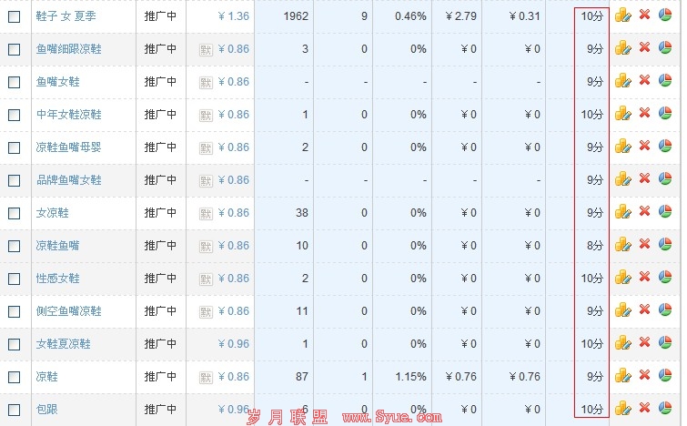 1. 质量得分低于10分的关键词不要作为主推关键词出价。