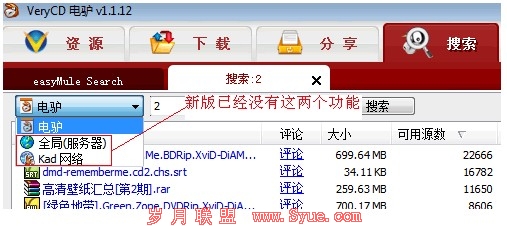 图3 VeryCD电驴删除了电驴网络搜索(ED2K和KAD)