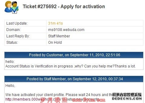 5.等待两个小时,你再用你刚才注册时候的用户名(用邮箱登陆),密码登陆http://members.000webhost.com/login.php进入会员区,你再进入“GET HELP",就可以看到你先前发的申请开通的信息已经得到回复,如下图: