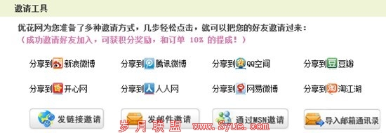在很多网站上都能看到“分享”的影子,把信息分享到微博、空间、SNS等平台,让用户在最便捷的操作下分享信息。不过虽然有“分享”按钮,主动分享的用户还是不多。如果分享可以给用户带来收益,主动分享的概率是不是会大大增加?把网站的部分收益分给用户,让用户在分享网站信息的同时有所收获,分享的积极性自然更高。笔者曾在一个订花网站-优花网下订单购买鲜花,系统提示,如果向好友推荐网站,可以享受折扣和积分优惠,我自然也乐意推荐给好友,因为能获得订花的优惠折扣。
