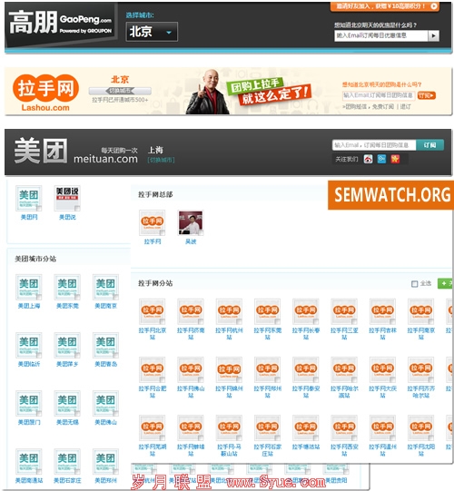 团购网站的商品大部分都有很强的地域性,而网站内容也是因此按照城市来组织。比如美团和拉手网给每个城市分配了一个二级域名,而高朋网则是沿用了groupon的模式,城市集中在/deals/目录下面。也是基于同样的原因,大型团购都无一例外的有一个选择城市工具和一个专门的城市列表, 比如美团网的默认首页就是城市列表,高朋在第一次访问时首页弹出层中便有城市选择列表。