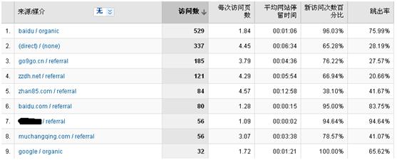 通过上图,大家可以看到,网站最大的9个来路,分别产生的后续效果。能看到“每次访问页数”“新访问次数百分比”“平均停留时间”“跳出率”等等。其中第7个来路,就是来自那条文字链广告的访问量。其它的来路停留时间最低的都是1分钟以上,而第7的个来路,网站停留时间平均只有2秒。基本上就打开网页还没看,就关闭了,人均PV也只有1.09是最低的,跳出率也是最差的。