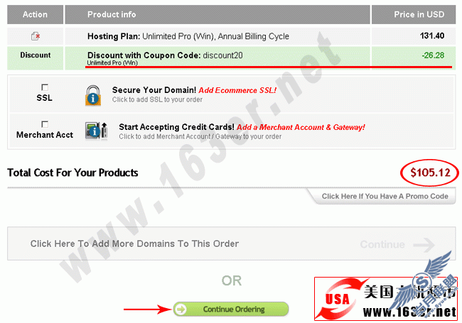 5、接下来可以看到订单价格发生了变化。价格由原来的131.4美元变为105.12美元。如果这一步出现错误提示的话,说明你不是从上面的专用链接进入的。然后,点continue ordering按钮继续下一步。