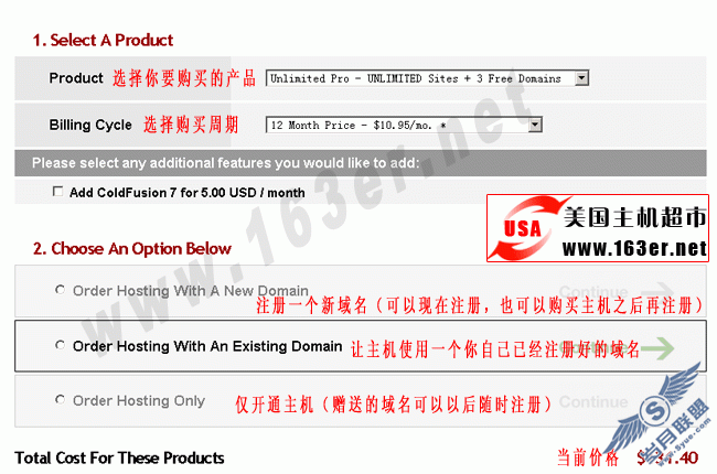 2、点击SIGN UP后,进入产品选择页面。我这里选择的是一年期的Windows无限空间,送3个域名和15个独立IP。