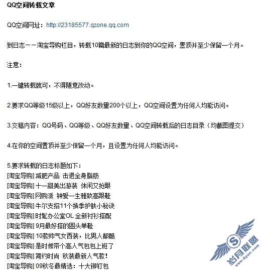 手动把满好友的QQ号码空间发上你准备好的淘客导购文章,文章资源可以上网搜索,要找那种容易被分享(指qq校友)、被转载(指QQ空间)的文章,不要一次性发很多文章,一次1到2篇,隔几天发一遍。
