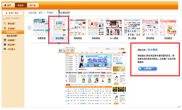 新推广综合频道用户连续7天有成交,7天成交金额200元以上,再额外奖励现金100元 推广方式:淘宝客只要从我们的淘宝联盟平台,获得综合频道代码,以恰当的形式展现。任何人通过您的推广(文字链、网站、博客或社区等)购买综合频道的商品,并完成交易。您就可以获得多重大奖和高额佣金。 1、登陆阿里妈妈,在淘宝客平台http://taoke.alimama.com/,选择频道推广—综合频道,在综合频道中选择立即推广,复制代码即可