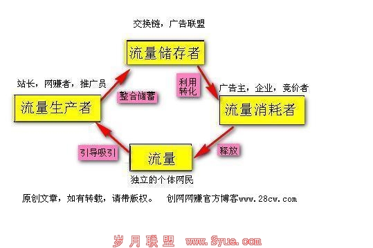 虽然各个环节都有其价值的获取(利益),每个环节都有做大做强的机会。但不是每个人都做起来,变强变大。发现自己的长处,擅长推广的去做流量生产者,擅长技术的做流量存蓄着(做平台),擅长销售转化或有货源的做竞价当流量消耗者。并且在此过程中要建立自己的核心竞争力-----独立品牌。才能将自己的流量价值提高。我会在下一篇文章中告诉大家一些如何打造独立品牌的我的见解,希望大家来我的博客创网网赚www.28cw.com来定期考察,我会不定期分享一些网赚项目给大家,也希望通过这样的一个平台认识更多的朋友,一起来交流学习,我的交流QQ群:82924409