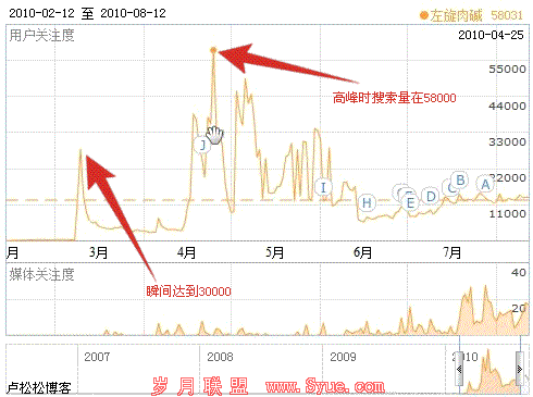 如下图所示,今年春节前网民对左旋肉碱的搜索量基本为0,但随着节目的热播,从2月中下旬,搜索量瞬间达到30000,高峰时搜索量在58000,这仅仅是百度指数统计的数据。