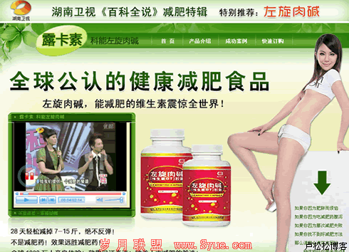 本 文也是卢松松学习网络营销的一些心得体会,本文有不对的地方欢迎大家多多指正,我把一个减肥类网站做了一次全面梳理,从中我们可以知道,在那个环节站长可 以参与进来。比如给商家设计精美网页、提供在线客服系统、帮商家选择广告投放媒体、代理竞价排名、给网站做SEO优化、帮该产品发布软文、收集竞争对手负 面消息等等,看似左旋肉碱这个和站长毫无关系的热门产品,也变得和我们息息相关。