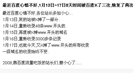 这个图是在站长站的论坛里找到的 呵,也许他的经历也是很多人的经历 百度,也许你现在壮大了,不需要各位站长了 难道这是真的吗???百度,你是不是有病啊--中国站长咋这么悲哀