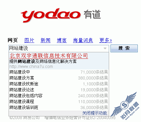 在搜索框的下方出现北京双宇通联信息技术有限公司,这个提示不可以说智能。不太了解有道这个“一键直达”提示的原理是什么,并不是自然结果的第一位的网站信息。看来人为控制的可能性很大?另外搜索“中华人民共和国”这个关键词竟然没有任何的“一键直达”的提示,这也太弱智了吧。公益类的网站信息还没有做到位就大力宣传了,充其量也就是个实验品。另外本人感觉“一键直达”会不会发展成3721那样,3721是输入中文进入网站,“一键直达”输入中文提示一个网站。如果结果完全公益化的这到是一个很好的创意功能,但如果一旦有道拥有了大的市场份额,估计这个“一键直达”转化为收费提示,会完全商业化。那样的话搜索引擎就是流氓软件。是不是以后搜索一下直接弹出一个窗口。只要你花钱买。3712模式又出现了。有道不仅要搜索有道,要更有搜索道义才行。只要把道义做好,超越BAIDU这个完全被金钱驱动的引擎只日可待。