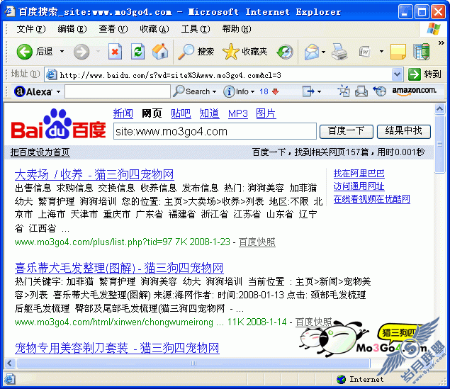 最近在做的站是一个宠物网站——猫三狗四宠物网,mo3go4.com,这个站是2008年1月21日正式上线的,上线的第2天,被google收录,当然并不多,只收录了2页,百度是2月1号收录的,收了157页,一共用了12天,应该说我还是挺满意,速度不慢,现在google每天都会增加我的收录,下面我来简单谈谈我这些天的做法。