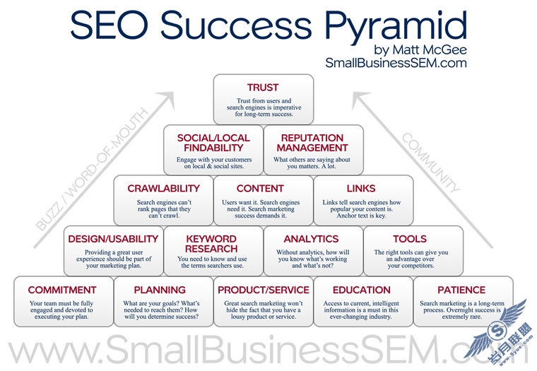 最近在老外SEO圈子里流行一篇文章,就是Small Business SEM的一篇名为SEO成功之金字塔模型(The SEO Success Pyramid)的文章。这篇文章主要归纳整套SEO项目最终获取成功所需要的一些支撑条件,并且总结成一张金字塔模型图。感觉这个模型图对SEO的人来说都有很好的指导作用,于是就把图篡改过来并对文字说明稍加改动。