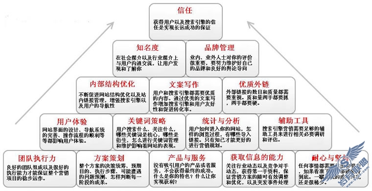 SEO的入门其实很简单,也至于很多人在看了网络上的一些知识就觉得自己会SEO了。事实上,一个成功的SEO项目并不是做垃圾站那样简单,本质是一套系统的过程,在操作过程中又渗透着各种细节处理。(垃圾站的处理过程其实不系统,没有真正SEO项目要考虑和注意的繁杂,所以能做垃圾站成功的人不一定能做好一个真正的SEO项目。)如何在这个系统过程中做好每一个步骤需要的不仅仅的SEO能力,还需要眼光和决策能力以及细节处理能力。下面这张SEO金字塔图简单介绍了这样一个系统的处理过程。