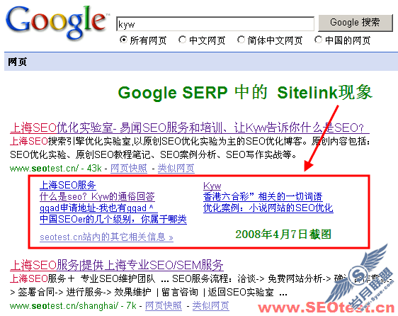 记得上海SEO实验室在2007年3月份吧,Google搜索“上海SEO”排名第一,然后就一直非常稳定,Google时常有的小波动都没影响到这个关键词的排名。2008年3月份,发现Seotest在搜索“上海SEO”时获得Sitelink。
