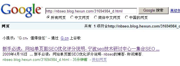2009.4.16 10:30 发现被google收录,即在该文发布后20几分钟后被google收录。