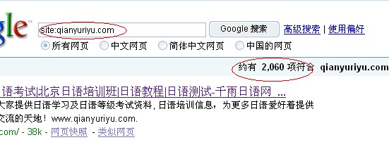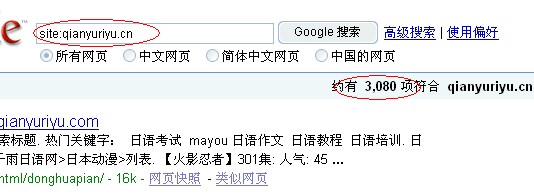 再看下面千雨日语网.cn域名的GG收录截图所示: