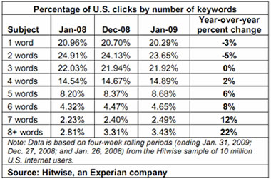 美国互联网流量检测机构Hitwise日前发布的报告显示,几家主要搜索引擎上的搜索项关键词正在变得越来越长。尽管平均搜索项的长度仍为2个单词,但是过去12个月间,长度超过4个单词的搜索项却越来越多。