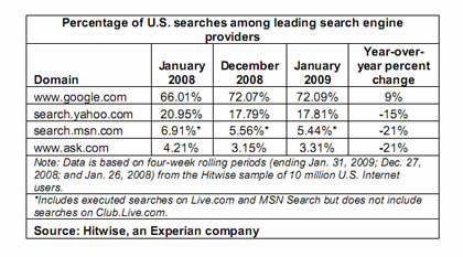 Hitwise的数据显示,谷歌的搜索引擎市场份额保持稳步增长,同比增幅为9%。而其主要竞争对手的份额均出现下滑。
