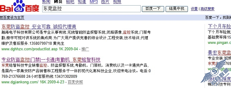 关于网站的SEO工作,其实都老生长谈了,我以前的一些文章也都有写过。这里简单提下,由于客户的关键词有好几个,分别是东莞监控、东莞防盗、东莞一卡通、东莞门禁、东莞考勤机,所以网站TITLE里我写的是"专业防盗监控|门禁|一卡通|考勤机_东莞铭智科技"。为什么要这样写,而不是写东莞防盗监控开头,因为地区词相对来说比较好做,而客户并非只是想在加上东莞时有排名,更多是想直接防盗监控就排前面,我想每个客户都一样吧,我们做服务的当然要以超越客户期望值为先,而在标题的结尾加上东莞铭智科技,这样TITLE里自然包含了东莞防盗监控。搜索引擎注重的是语言简洁明了,并非一定要堆在一起。description(东莞铭智科技专业销售监控、防盗报警系统,考勤机、门禁机、消费机以及一卡通类产品,是国内一家集安防产品销售和工程服务于一体的现代化高科技企业,欢迎来电洽谈。)也很自然地包含了所需关键词。网站的底部重复了一下网站的主要关键词,这也是很有帮助的。