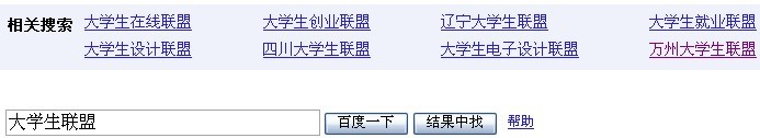 就前天的时候我在百度里搜“大学生联盟”,我的网站竟然排在百度首页了,对于这个比较热门的关键词能排首页我感到非常高兴。可是好景不长,才两三天我再搜“大学生联盟”,我的网站别说百度首页,不知道掉在哪后面去了,翻了半天都没有翻到。只是在下面的相关搜索里面还是有个“万州大学生联盟”(如下图),真是让我大喜大悲!