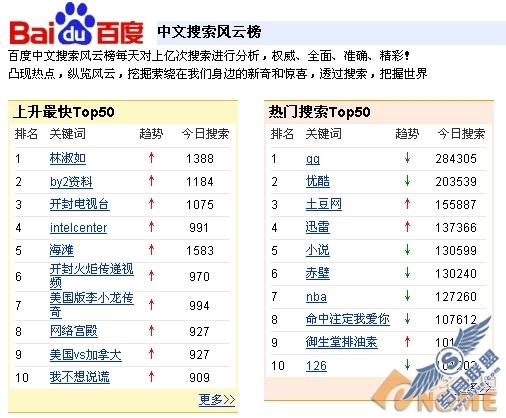 百度搜索风云榜是提供关键字词搜索次数排行的一项服务,每天发布的关键词风云榜,系根据前一天0:00--24:00的搜索量统计自动计算生成,每天早上自动更新。 推陈出新是互联网的趋势,作为搜索品牌网站百度当然也当仁不让。该服务改版后二级域名top.baidu.com。