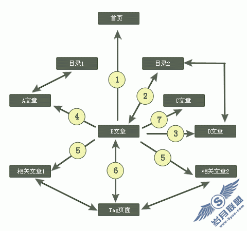 程序员的SEO工作:如下图链接关系图。我们处在B文章页面,那么就可以在该页导出一些链接到网站的其他页。