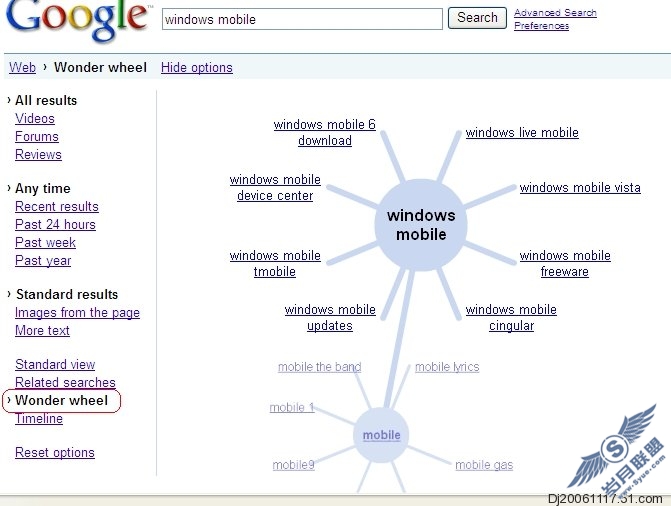 我们可以看到左边出现一栏关于搜索结果的分类,所有的结果分为录像,论坛,简述,按时间有最近的,24小时以前的等,或者是以标准的结果显示,重点提的是下面的wonder wheel这个功能,译为意向齿轮,就是搜索功能会以一个齿轮的模式为用户列于一个同他搜索的关键字相关的选项,方便用户更快捷的查询!