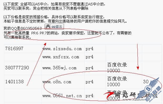 看到没有,上面的部分显示一部分卖链接的人员的心理,他还是怕搜索引擎能知道的,因为他们混到那么高的Pr值很不容易,下面的一部分人就属于出生牛犊不怕虎了,明码注明自己的网站网址,买卖价格。