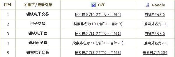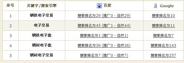 这是Zack的一个客户的站,就不贴网址了,我针对不同的关键词和不同的搜索引擎做的一个排名实验。针对GOOGLE,使用“钢铁电子交易”“电子交易”为锚文本,做了大量质量较高的外链。针对百度,在内容上围绕“钢铁电子盘”“钢材电子交易”做好文章内容在刚开始的时候,由于这5个关键词都没有排名,所以当时没截图。
