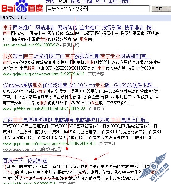 在百度搜索“南宁SEO专业服务”这一关键词,搜索结果竟然有百度首页的快照出现在第五个位置。这还不算怪,大家看看它的网页快照的描述是:全球最大的中文搜索引擎,一直致力于倾听、挖掘与满足中国网民的需求,秉承“用户体验至上”的理念,除网页搜索外,还提供MP3、文档、地图、传情、影视等多样化的搜索服务,率先创造了以贴吧、知道为代表的搜索社区……