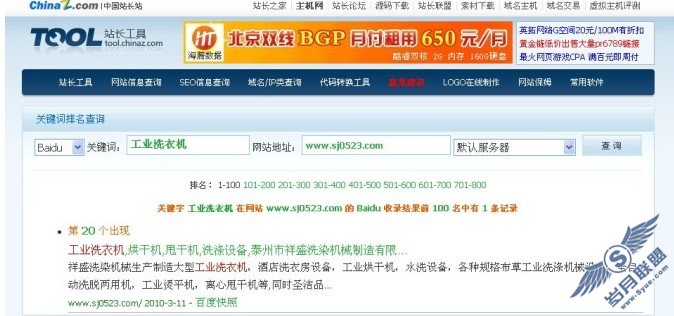 今年3月4日把自己的企业网站挂到网上,我就去当地流量大的人才招聘网站发了2条信息,用友情链接查询工具查询网站获得线上链接,这个可是永久的链接的,目前提供这种查询的网站太多了,有多少你就查多少吧!然后我就到自己的环球洗涤设备网注册发布了一些产品信息,一天对网站的工作全部结束!耐心的等待了第二天中午,网站果然被收录了。